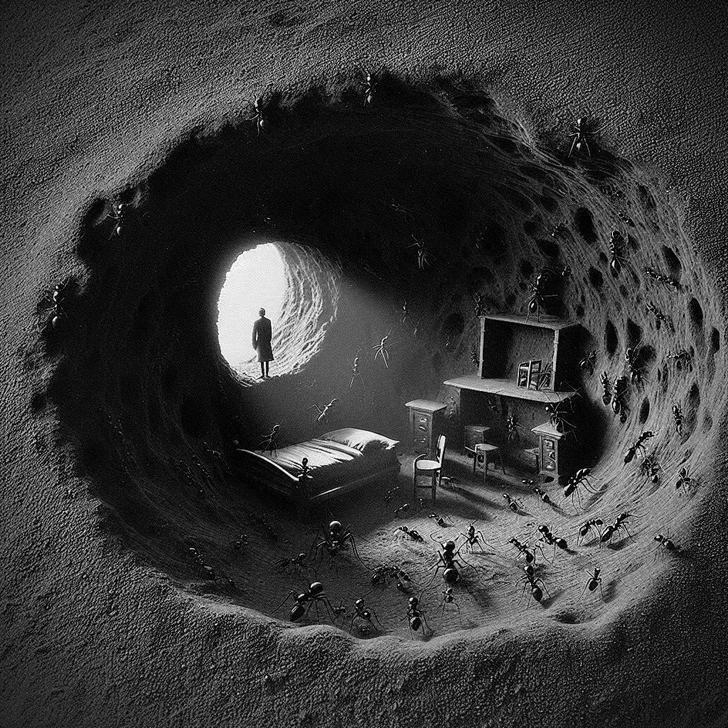 Die narrativen Motive der Schwarzen Romantik beschäftigen sich mit dem Abgründigen und Geheimnisvollen. Eine daraus resultierende Wirkung zielt darauf ab, irrationale Ängste, abergläubische Vorstellungen oder Wahnsinn zu erzeugen. Die Serie „Formicidae“ visualisiert diese wirkungsästhetische Intention über eine spezifische Raumkonstellation, in welcher Mensch und Ameise eine unterirdische, staatenbildende Symbiose eingehen. Auf diese Weise wird das dualistische Modell der gegensätzlichen Systeme von Natur und Kultur aufgelöst. Es entsteht ein neuer, synergetisch interagierender Superorganismus.